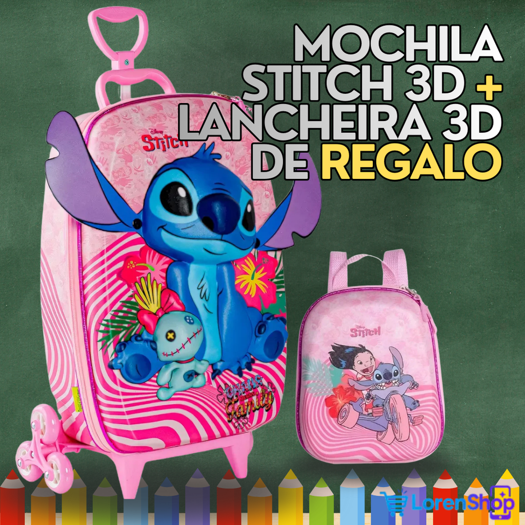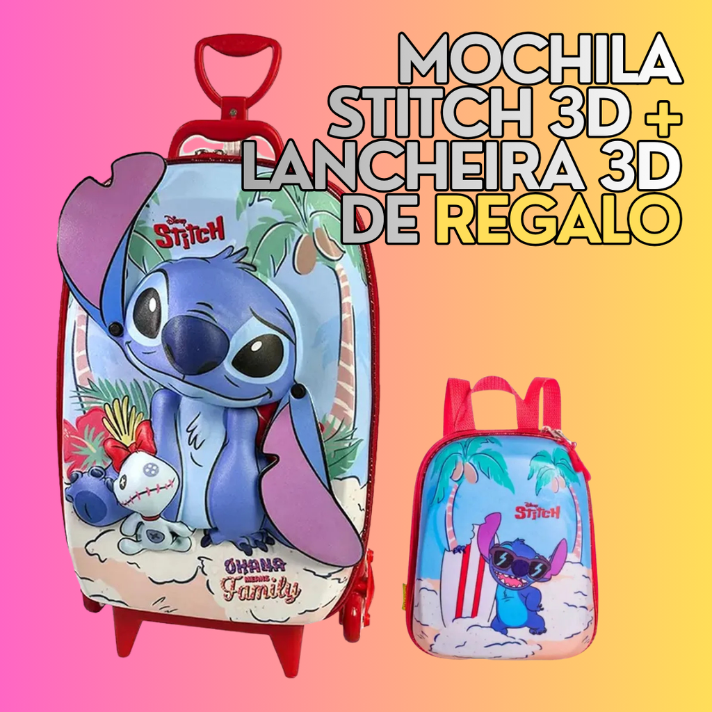 La Mochila con Carro Stitch 3D con Orejas Móviles incluye una lancheira 3D de REGALO, formando un set completo ideal para el colegio y el uso diario.